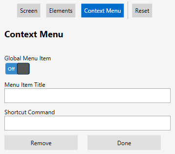 Specifies the menu item as screen-specific or global. If set to On, the menu item appears on the context menu for every screen. If set to Off, the menu item appears only on the context menu for the current screen.