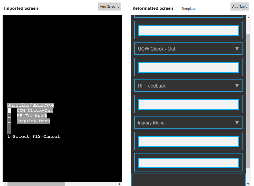 The Velocity Client utilizes a built-in HTML and CSS rendering engine to interpret the design of your TE screen captures, rather than requiring a complete redesign of your emulation server. The purpose of this built-in engine is to apply web design elements to traditional black-and-green screens to create a more modern appearance for screens, menus, and individual elements. By default, Velocity interprets your existing screens with a predictive formatting functionality that interprets the layout of each screen and the presentation of individual elements.
